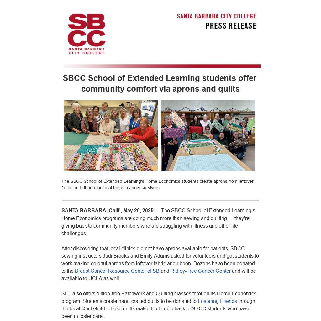 SANTA BARBARA, Calif., May 20, 2025 The SBCC School of Extended Learning’s Home Economics programs are doing much more than sewing and quilting … they’re giving back to community members who are struggling with illness and other life challenges.