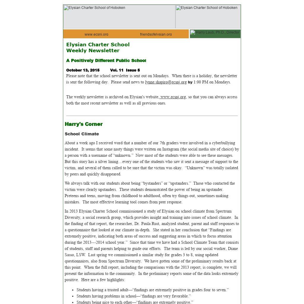 The weekly newsletter is archived on Elysian's website, www.ecsnj.org, so that you can always access both the most recent newsletter as well as all previous ones.