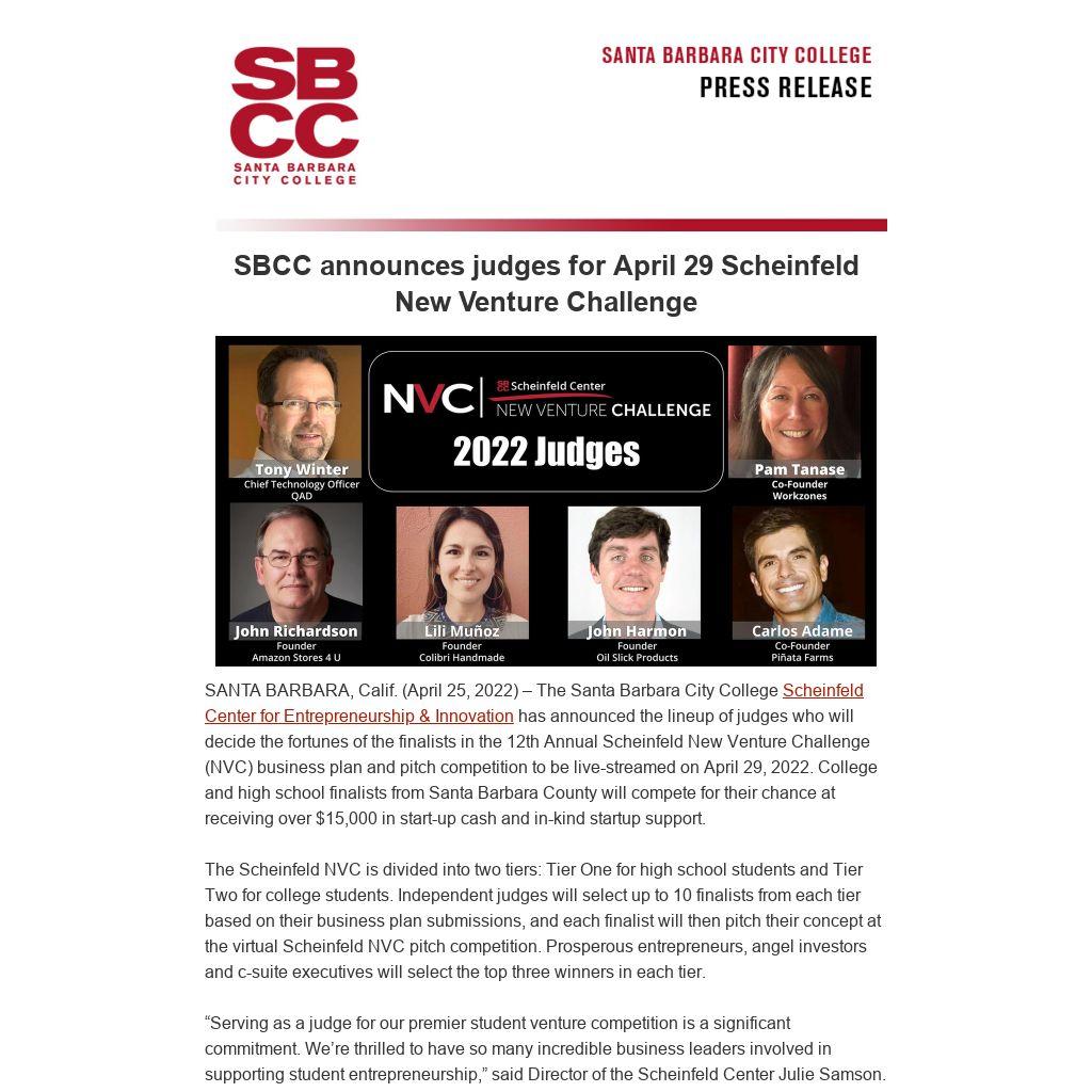 SANTA BARBARA, Calif. (April 25, 2022) – The Santa Barbara City College Scheinfeld Center for Entrepreneurship & Innovation has announced the lineup of judges who will decide the fortunes of the finalists in the 12th Annual Scheinfeld New Venture Challenge (NVC) business plan and pitch competition to be live-streamed on April 29, 2022. College and high school finalists from Santa Barbara County will compete for their chance at receiving over $15,000 in start-up cash and in-kind startup support.