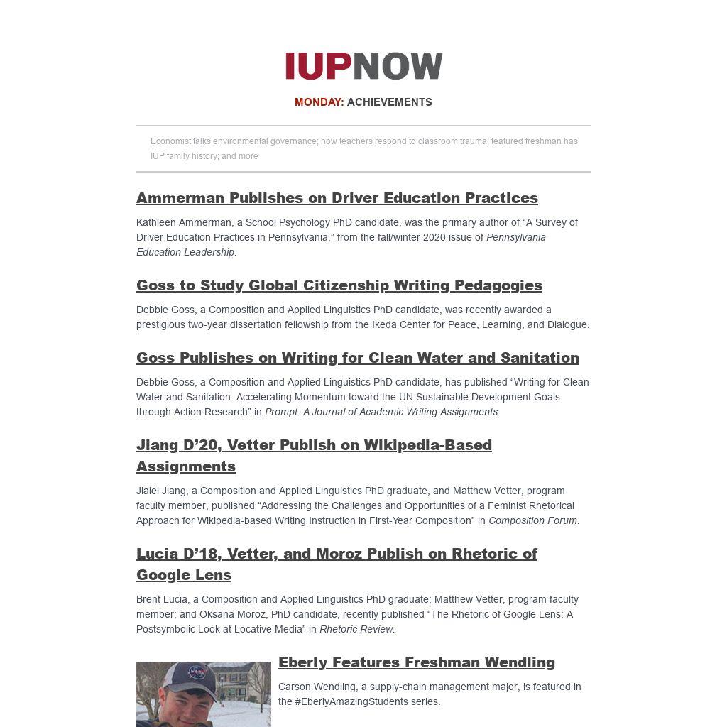 Distributed to IUP employees and students four days a week, IUP Now is the official newsletter of Indiana University of Pennsylvania. It features news from across the IUP website, compiled by the Division of Marketing and Communications. Find out how to get your news and events in IUP Now.