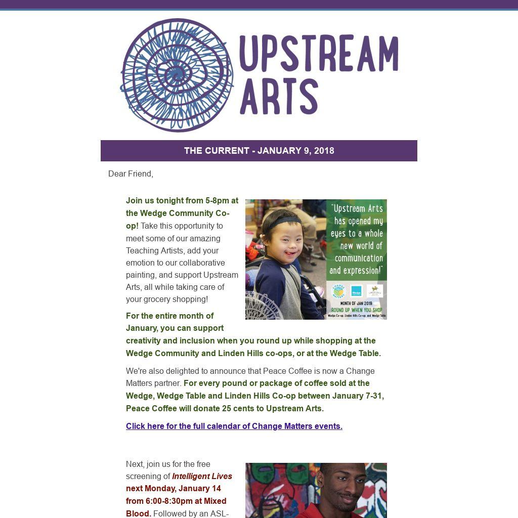 We're also delighted to announce that Peace Coffee is now a Change Matters partner. For every pound or package of coffee sold at the Wedge, Wedge Table and Linden Hills Co-op between January 7-31, Peace Coffee will donate 25 cents to Upstream Arts.