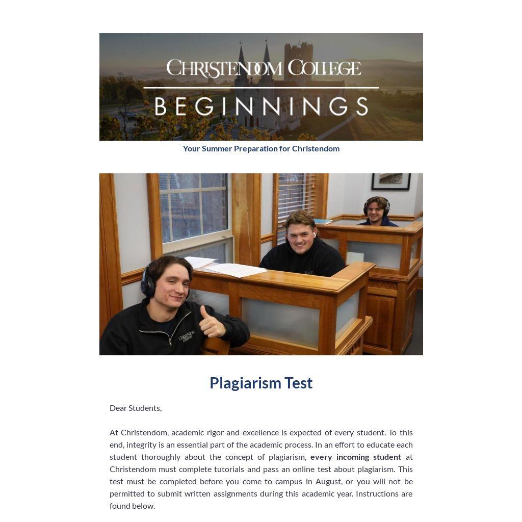 At Christendom, academic rigor and excellence is expected of every student. To this end, integrity is an essential part of the academic process. In an effort to educate each student thoroughly about the concept of plagiarism, every incoming student at Christendom must complete tutorials and pass an online test about plagiarism. This test must be completed before you come to campus in August, or you will not be permitted to submit written assignments during this academic year. Instructions are found below.