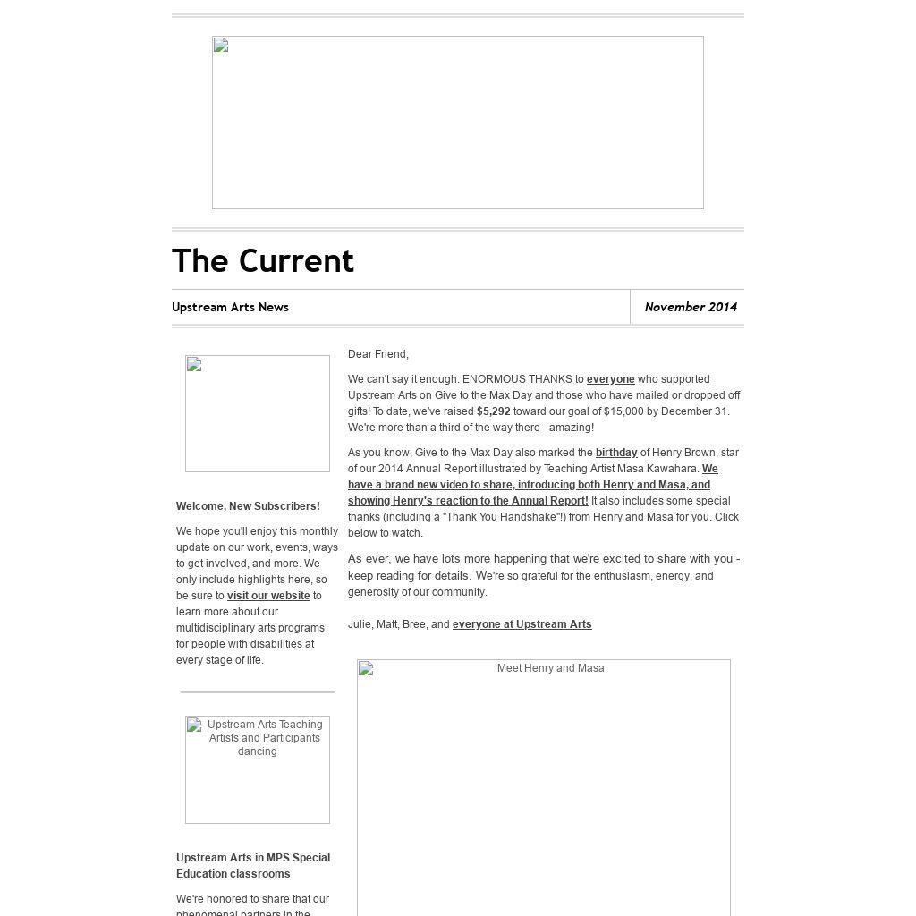 | Gratitude and the Work Ahead Once again, we are grateful to everyone who supported Upstream Arts through Give to the Max Day and our fall fund appeal these past few weeks! We're also ever grateful to our current monthly donors for their profoundly valuable steadfast support: Sue Haas and Michael Sommers, Marilyn Mounger, and one anonymous donor. We still have $9,708 to raise before December 31 in order to meet our $15,000 year-end goal! If you haven't given to Upstream Arts yet this fall, please consider chipping in now. Your support will ensure more aspiring artists like Henry Brown, young people like our participants at the Milwaukee JCC, and adults at day programs like MSS can access and thrive in our high-quality, curriculum-based, multidisciplinary programs, taught by some of the Twin Cities' most accomplished professional artists. Remember, you can always donate to Upstream Arts online at GiveMN.org, call (612) 331-4584 to make a gift by phone, or mail checks to our office at 3501 Chicago Ave S, Minneapolis, MN 55403. Thank you so much for your partnership!