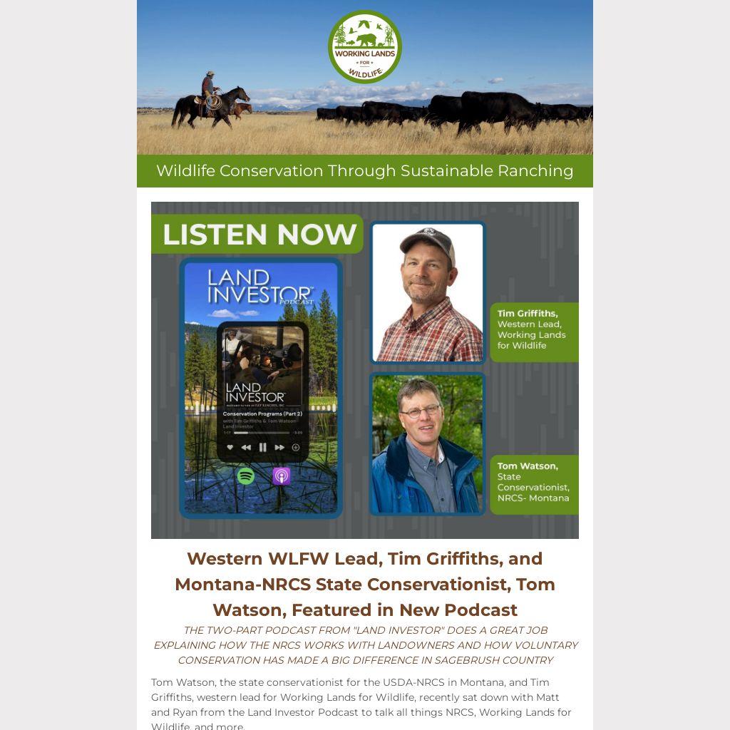 Tom Watson, the state conservationist for the USDA-NRCS in Montana, and Tim Griffiths, western lead for Working Lands for Wildlife, recently sat down with Matt and Ryan from the Land Investor Podcast to talk all things NRCS, Working Lands for Wildlife, and more.