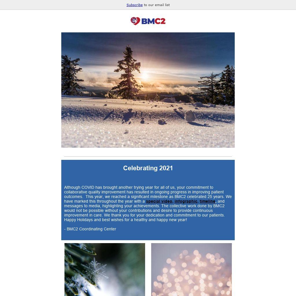 Although COVID has brought another trying year for all of us, your commitment to collaborative quality improvement has resulted in ongoing progress in improving patient outcomes. This year, we reached a significant milestone as BMC2 celebrated 25 years. We have marked this throughout the year with a special video, infographic, timeline, and messages to media, highlighting your achievements. The collective work done by BMC2 would not be possible without your contributions and desire to provide continuous improvement in care. We thank you for your dedication and commitment to our patients. Happy Holidays and best wishes for a healthy and happy new year!