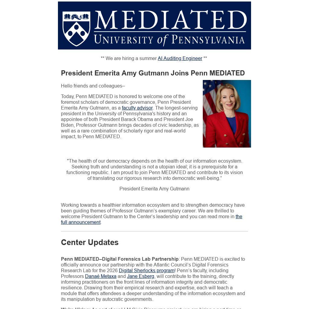 "The health of our democracy depends on the health of our information ecosystem. Seeking truth and understanding is not a utopian ideal; it is a prerequisite for a functioning republic. I am proud to join Penn MEDIATED and contribute to its vision of translating our rigorous research into democratic well-being.”