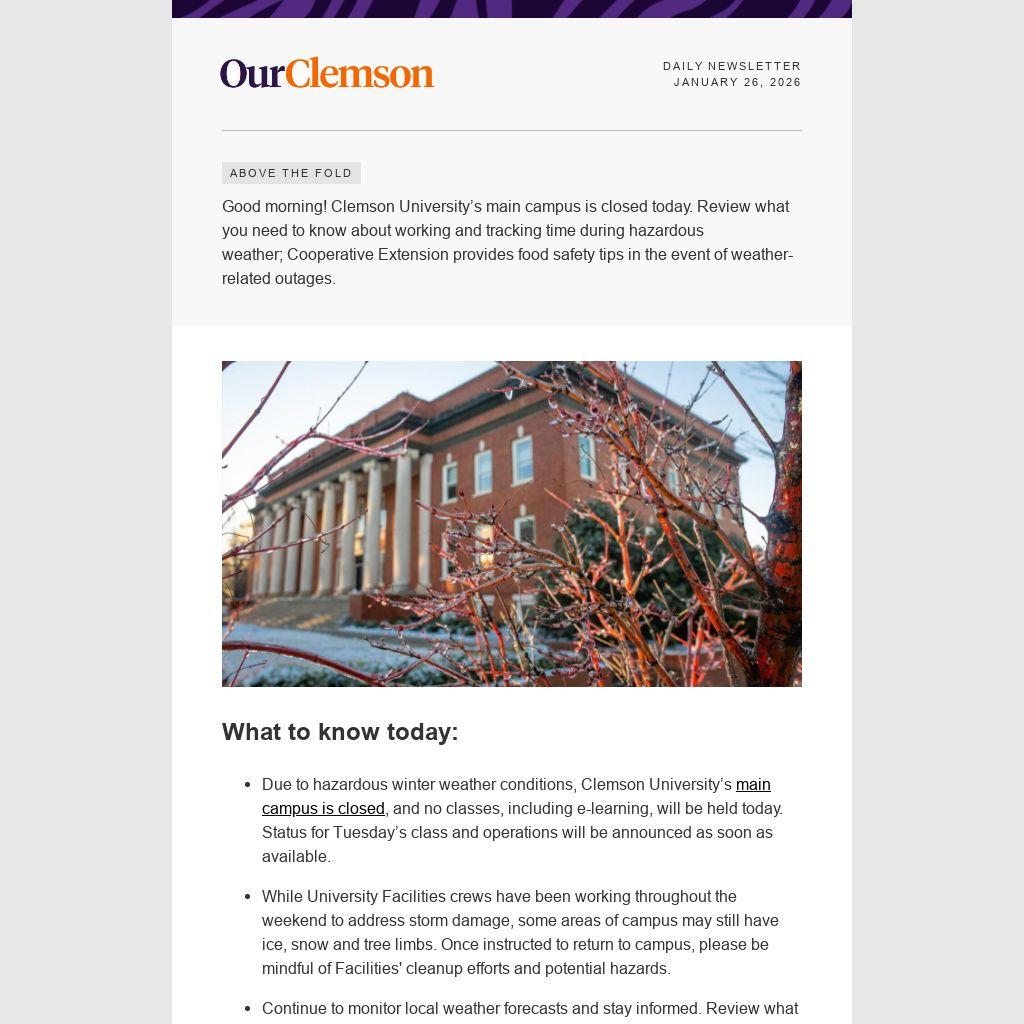 Good morning! Clemson University’s main campus is closed today. Review what you need to know about working and tracking time during hazardous weather; Cooperative Extension provides food safety tips in the event of weather-related outages.