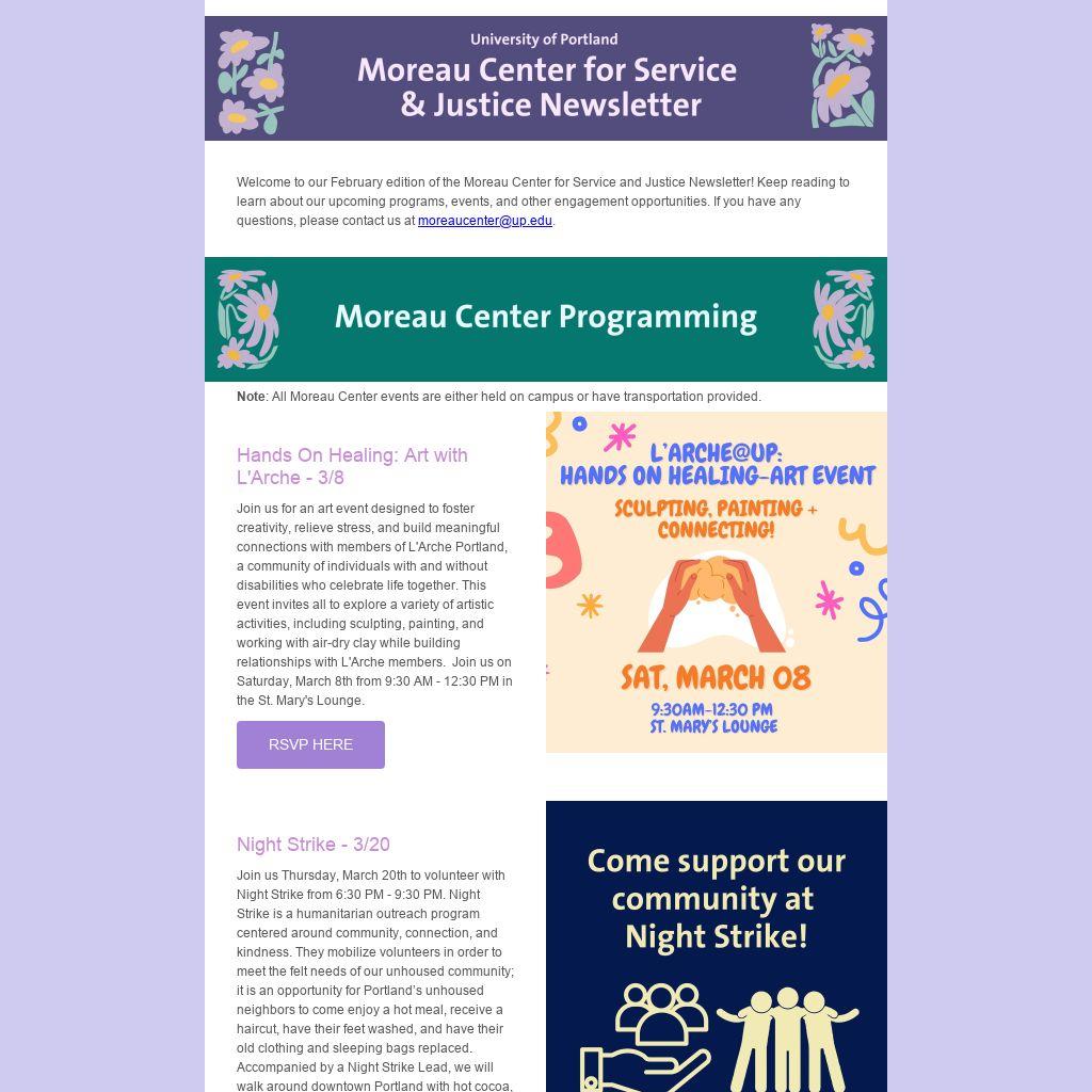 Welcome to our February edition of the Moreau Center for Service and Justice Newsletter! Keep reading to learn about our upcoming programs, events, and other engagement opportunities. If you have any questions, please contact us at moreaucenter@up.edu.