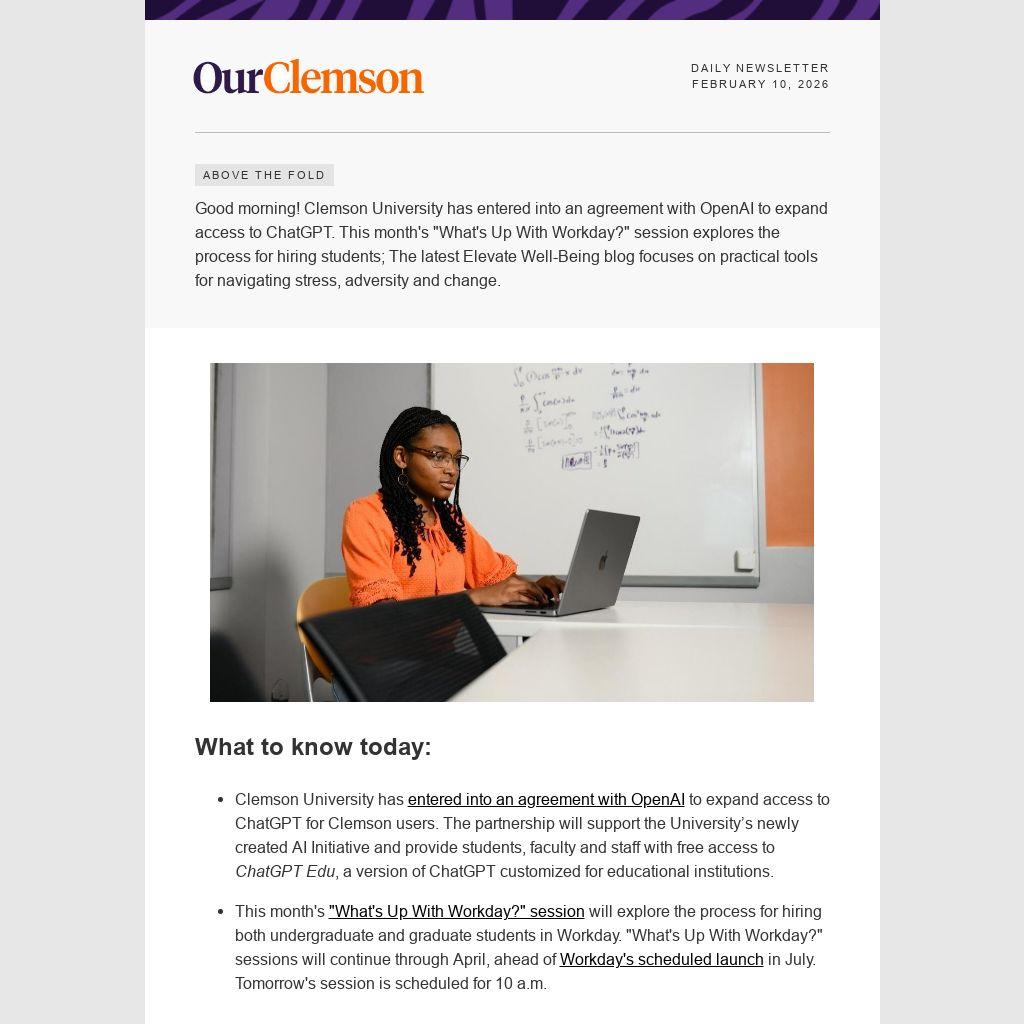 Good morning! Clemson University has entered into an agreement with OpenAI to expand access to ChatGPT. This month's "What's Up With Workday?" session explores the process for hiring students; The latest Elevate Well-Being blog focuses on practical tools for navigating stress, adversity and change.