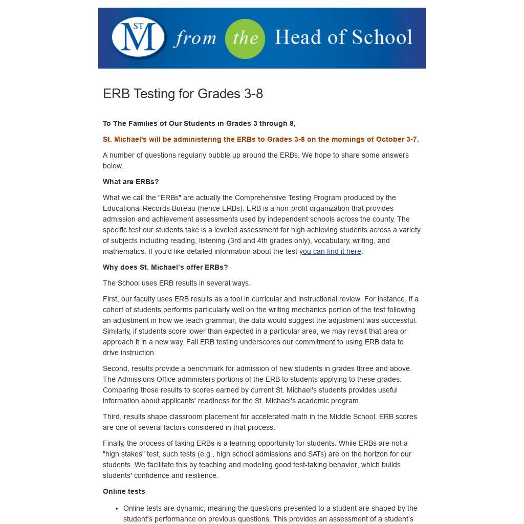 St. Michael's will be administering the ERBs to Grades 3-8 on the mornings of October 3-7.