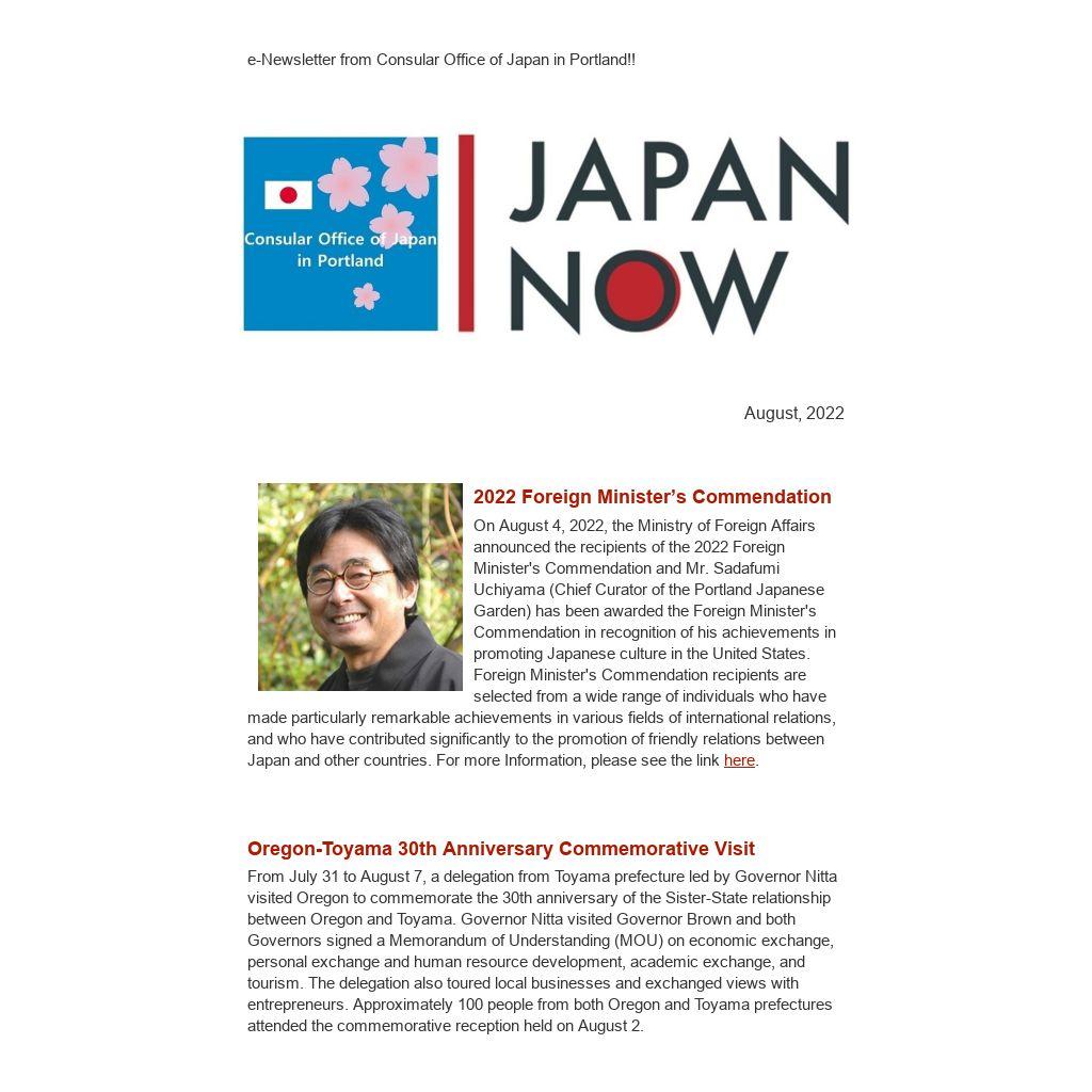 From July 31 to August 7, a delegation from Toyama prefecture led by Governor Nitta visited Oregon to commemorate the 30th anniversary of the Sister-State relationship between Oregon and Toyama. Governor Nitta visited Governor Brown and both Governors signed a Memorandum of Understanding (MOU) on economic exchange, personal exchange and human resource development, academic exchange, and tourism. The delegation also toured local businesses and exchanged views with entrepreneurs. Approximately 100 people from both Oregon and Toyama prefectures attended the commemorative reception held on August 2.