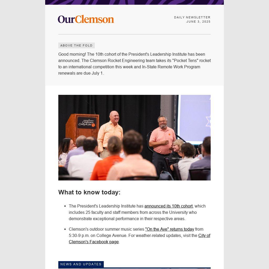 Good morning! The 10th cohort of the President's Leadership Institute has been announced. The Clemson Rocket Engineering team takes its "Pocket Tens" rocket to an international competition this week and In-State Remote Work Program renewals are due July 1.