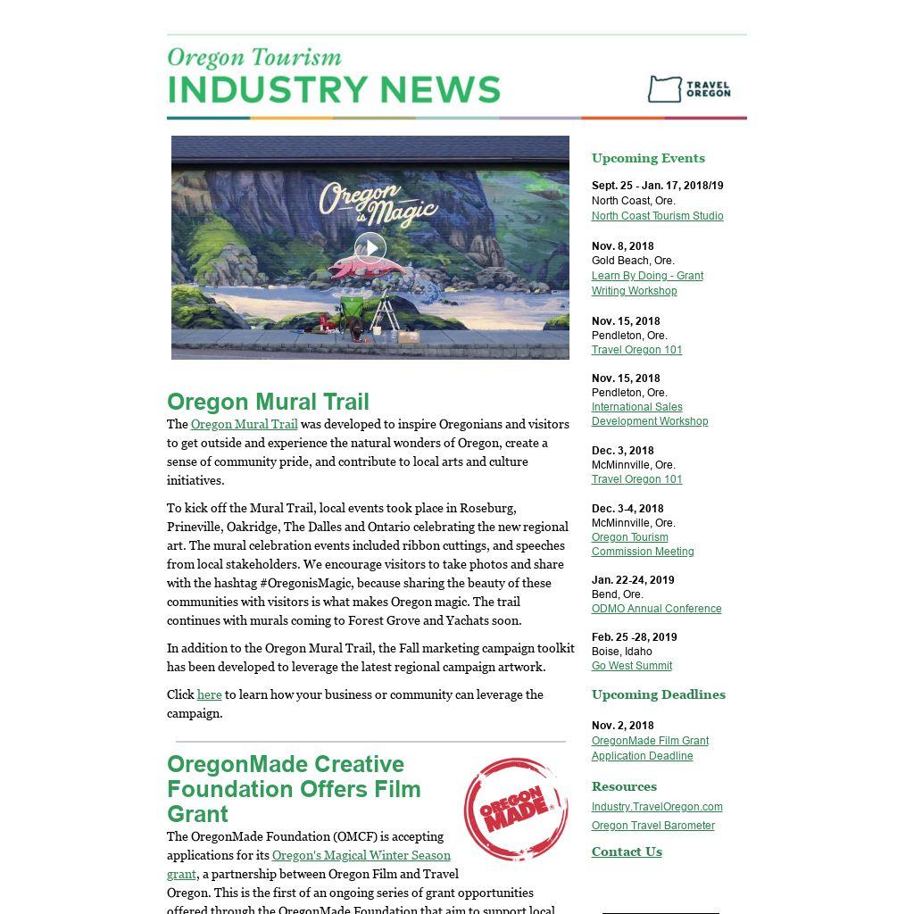 Oregon Mural Trail The Oregon Mural Trail was developed to inspire Oregonians and visitors to get outside and experience the natural wonders of Oregon, create a sense of community pride, and contribute to local arts and culture initiatives. To kick off the Mural Trail, local events took place in Roseburg, Prineville, Oakridge, The Dalles and Ontario celebrating the new regional art. The mural celebration events included ribbon cuttings, and speeches from local stakeholders. We encourage visitors to take photos and share with the hashtag #OregonisMagic, because sharing the beauty of these communities with visitors is what makes Oregon magic. The trail continues with murals coming to Forest Grove and Yachats soon. In addition to the Oregon Mural Trail, the Fall marketing campaign toolkit has been developed to leverage the latest regional campaign artwork. Click here to learn how your business or community can leverage the campaign.