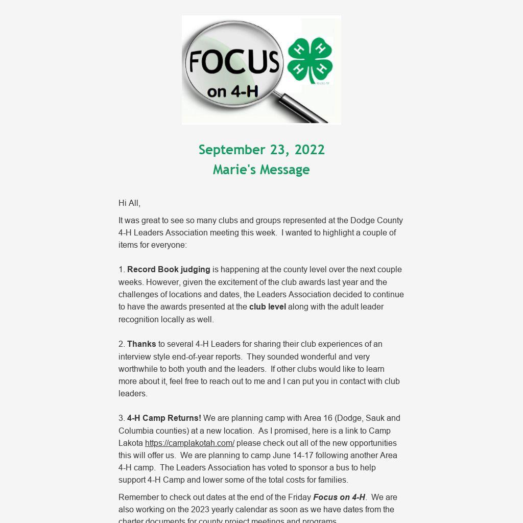 It was great to see so many clubs and groups represented at the Dodge County 4-H Leaders Association meeting this week. I wanted to highlight a couple of items for everyone: