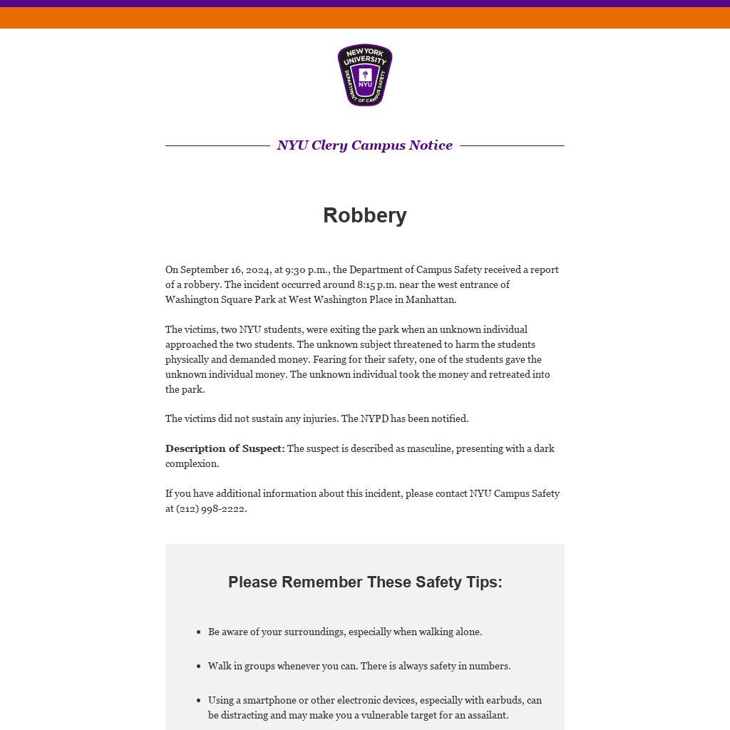 On September 16, 2024, at 9:30 p.m., the Department of Campus Safety received a report of a robbery. The incident occurred around 8:15 p.m. near the west entrance of Washington Square Park at West Washington Place in Manhattan.