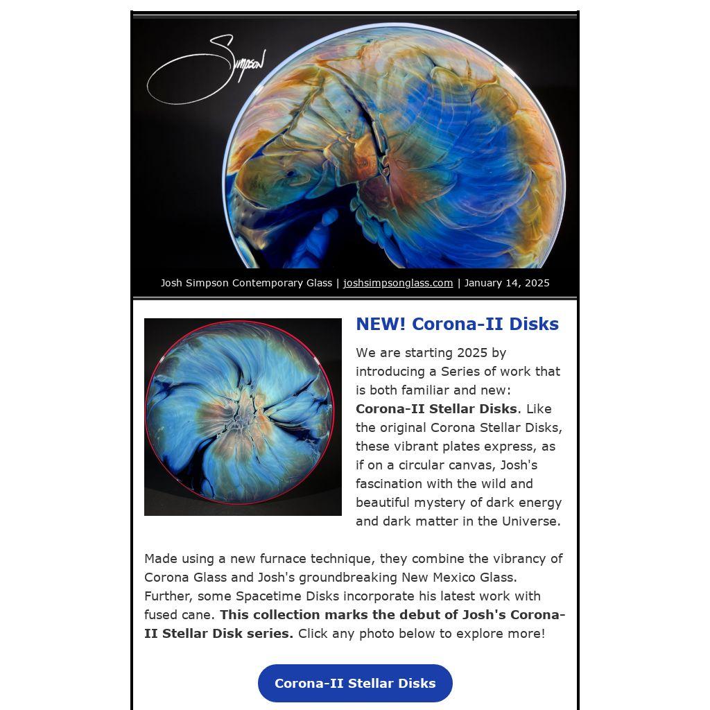 Now, for the University Museums’ 50th Anniversary, Simpson was again commissioned to create a signature object for the permanent collection. This resulted in a suite of eleven Stellar Disks, all of which are presented in this exhibition along with earlier works of his glass art.