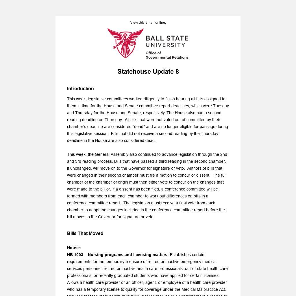 HB 1190 – Free speech at state educational institutions: The bill provides that a state educational institution may not: (1) designate an outdoor area on campus as an area where protected expressive activities are prohibited; (2) deny any benefit or privilege to, or discriminate against, a religious, political, or ideological student organization for its protected expressive activity; and (3) deny a benefit to or discriminate against a religious, political, or ideological student organization based on the protected expressive activity or a requirement of the student organization. Allows a state educational institution to enforce reasonable time, place, and manner restrictions that comply with certain requirements. Requires a state educational institution to create and publish protected expressive activity policies. Provides that a student or student organization may bring a cause of action for a violation of free speech rights. Allows a court to award injunctive relief, compensatory damages, reasonable court costs, and attorney's fees to an aggrieved student or student organization if the court finds that a violation occurred. Allows a court to award compensatory damages up to $50,000. Provides that a state educational institution is not immune from certain liability. Requires the commission for higher education to create a form for a state educational institution to submit information on an alleged violation of this chapter. The bill was amended and passed out of the Senate Judiciary Committee, where Ball State, provided testimony in support of the bill on behalf of several of our sister institutions as well. HB 1190 is now eligible for a second reading by the Senate.