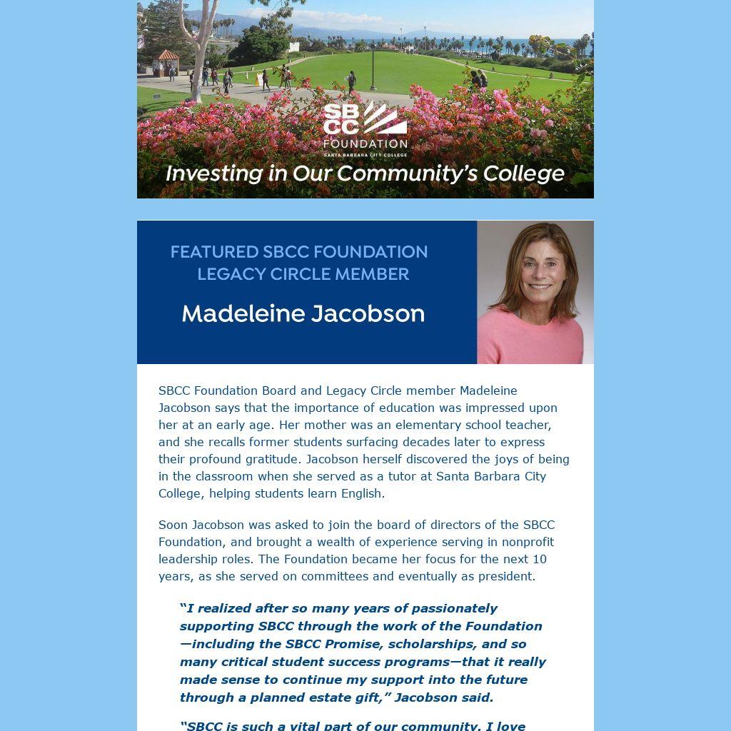 Thanks to Legacy Circle members like Madeleine Jacobson who include gifts to the SBCC Foundation in their estate plans, Santa Barbara City College and its students will continue to thrive for years to come.