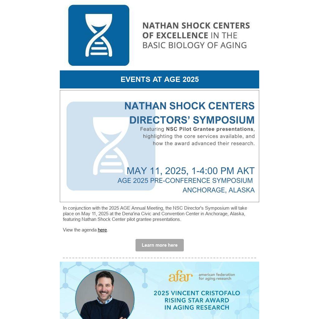 In conjunction with the 2025 AGE Annual Meeting, the NSC Director's Symposium will take place on May 11, 2025 at the Dena'ina Civic and Convention Center in Anchorage, Alaska, featuring Nathan Shock Center pilot grantee presentations.
