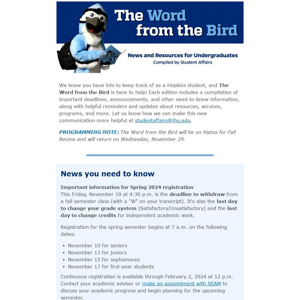 We know you have lots to keep track of as a Hopkins student, and The Word from the Bird is here to help! Each edition includes a compilation of important deadlines, announcements, and other need-to-know information, along with helpful reminders and updates about resources, services, programs, and more. Let us know how we can make this new communication more helpful at studentaffairs@jhu.edu.