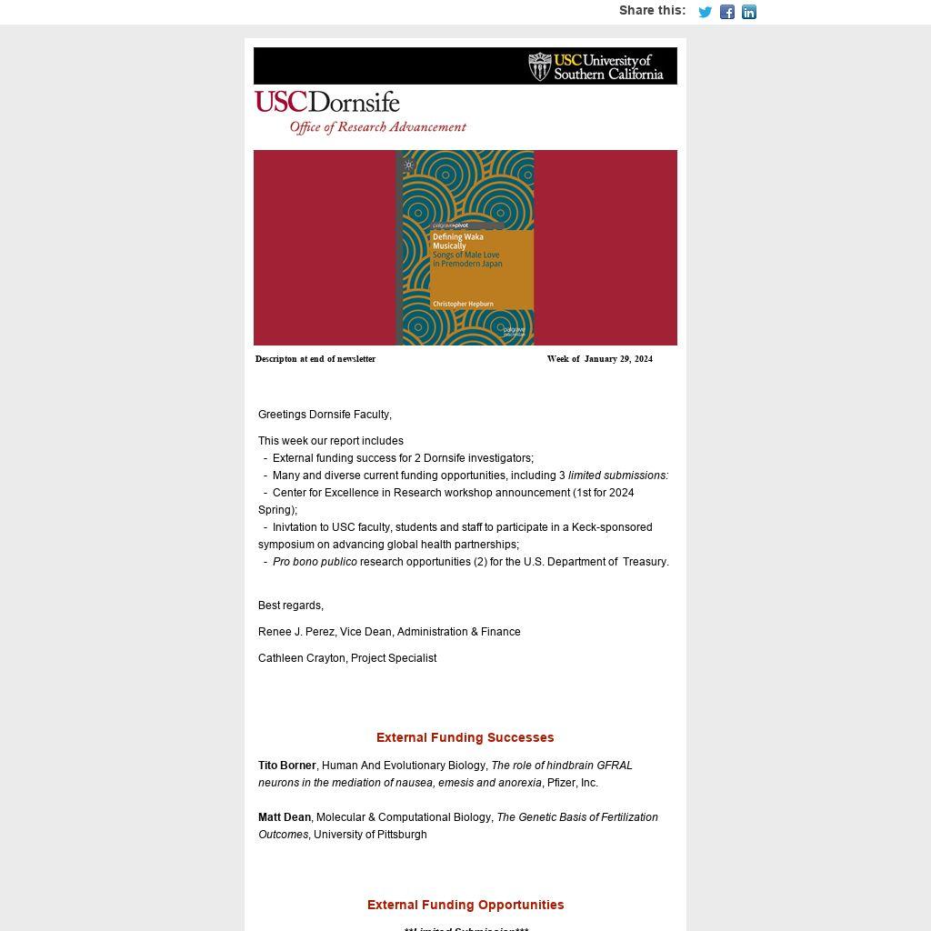 This week our report includes - External funding success for 2 Dornsife investigators; - Many and diverse current funding opportunities, including 3 limited submissions: - Center for Excellence in Research workshop announcement (1st for 2024 Spring); - Inivtation to USC faculty, students and staff to participate in a Keck-sponsored symposium on advancing global health partnerships; - Pro bono publico research opportunities (2) for the U.S. Department of Treasury.