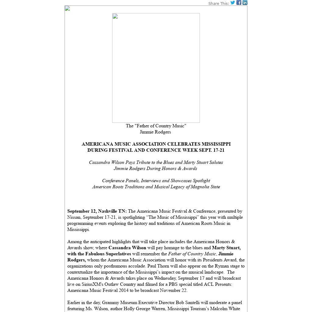 September 12, Nashville TN: The Americana Music Festival & Conference, presented by Nissan, September 17-21, is spotlighting “The Music of Mississippi” this year with multiple programming events exploring the history and traditions of American Roots Music in Mississippi.
