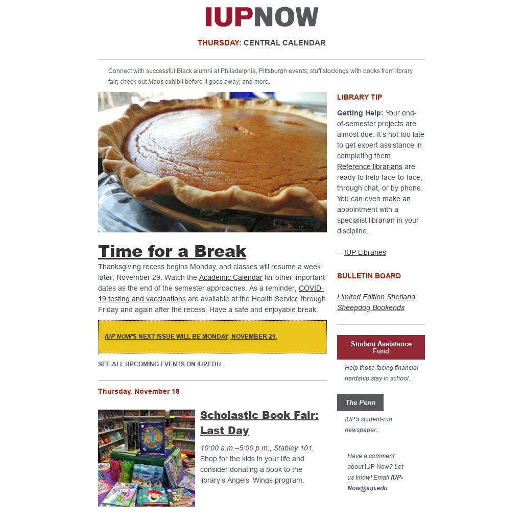 Publication schedule: Monday: Achievements; Wednesday: University News, For Students and Advisors, and For Employees; Thursday: Calendar, Academic/Library Tip, and Bulletin Board (employees only). Deadline: Items must be submitted via the IUP website to the Digital Team by noon, two business days before publication. Learn more about the newsletter’s publication schedule.