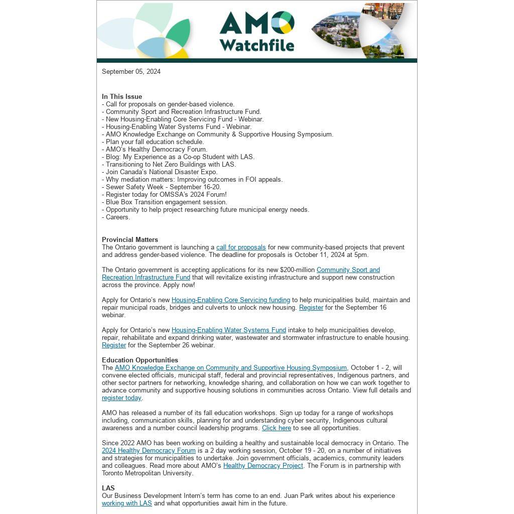 *Disclaimer: The Association of Municipalities of Ontario (AMO) is unable to provide any warranty regarding the accuracy or completeness of third-party submissions. Distribution of these items does not imply an endorsement of the views, information or services mentioned.