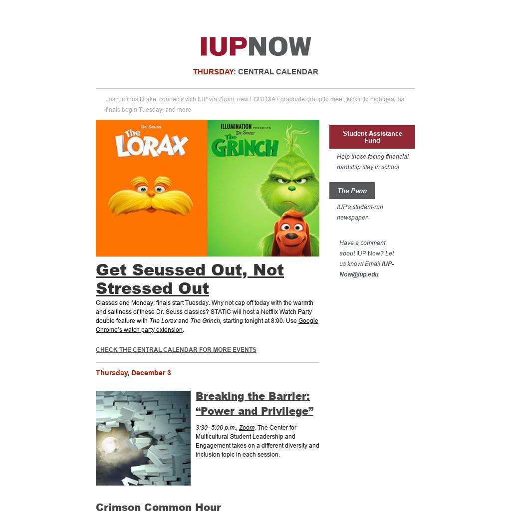 For more information on any item in IUP Now, please contact the department that posted the original item. To report an inaccuracy, please contact the posting department as well as the IUP Now production team at IUP-Now@iup.edu. Posting departments are responsible for the accuracy of items included in IUP Now.