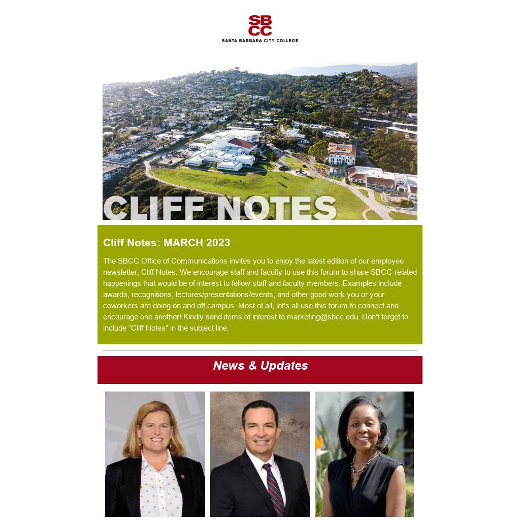 The SBCC Office of Communications invites you to enjoy the latest edition of our employee newsletter, Cliff Notes. We encourage staff and faculty to use this forum to share SBCC-related happenings that would be of interest to fellow staff and faculty members. Examples include awards, recognitions, lectures/presentations/events, and other good work you or your coworkers are doing on and off campus. Most of all, let's all use this forum to connect and encourage one another! Kindly send items of interest to marketing@sbcc.edu. Don't forget to include “Cliff Notes” in the subject line.
