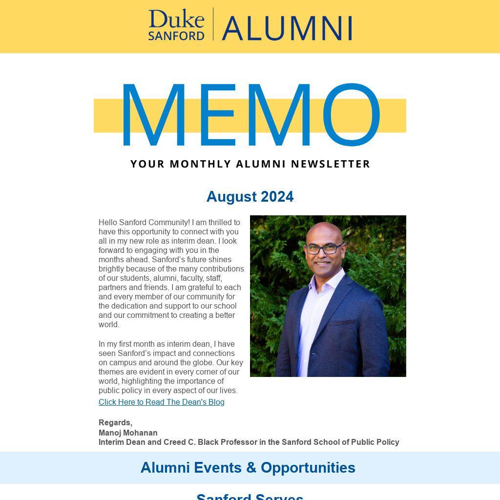 Hello Sanford Community! I am thrilled to have this opportunity to connect with you all in my new role as interim dean. I look forward to engaging with you in the months ahead. Sanford’s future shines brightly because of the many contributions of our students, alumni, faculty, staff, partners and friends. I am grateful to each and every member of our community for the dedication and support to our school and our commitment to creating a better world.