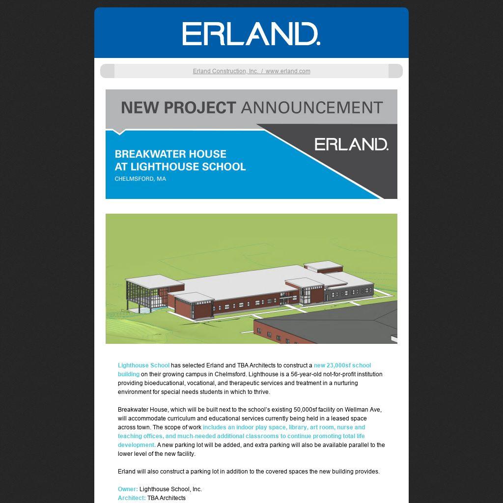 Lighthouse School has selected Erland and TBA Architects to construct a new 23,000sf school building on their growing campus in Chelmsford. Lighthouse is a 56-year-old not-for-profit institution providing bioeducational, vocational, and therapeutic services and treatment in a nurturing environment for special needs students in which to thrive.