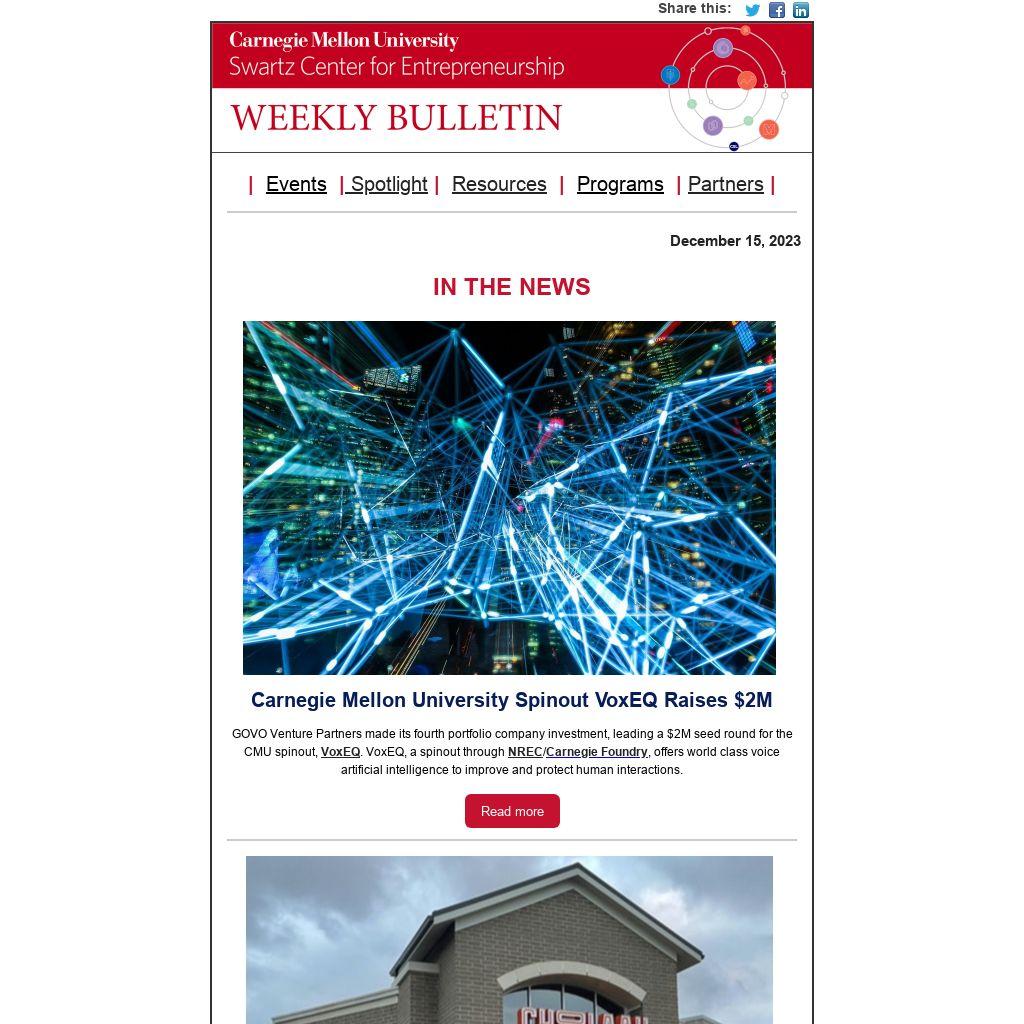 Have startup news or opportunities to share? Have questions about the Swartz Center Weekly Bulletin? Send news, opportunities or questions to Sonya Ford, Program Manager.