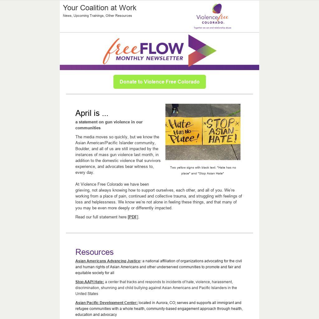 At Violence Free Colorado we have been grieving, not always knowing how to support ourselves, each other, and all of you. We’re working from a place of pain, continued and collective trauma, and struggling with feelings of loss and helplessness. We know we’re not alone in feeling these things, and that many of you may be even more deeply or differently impacted.
