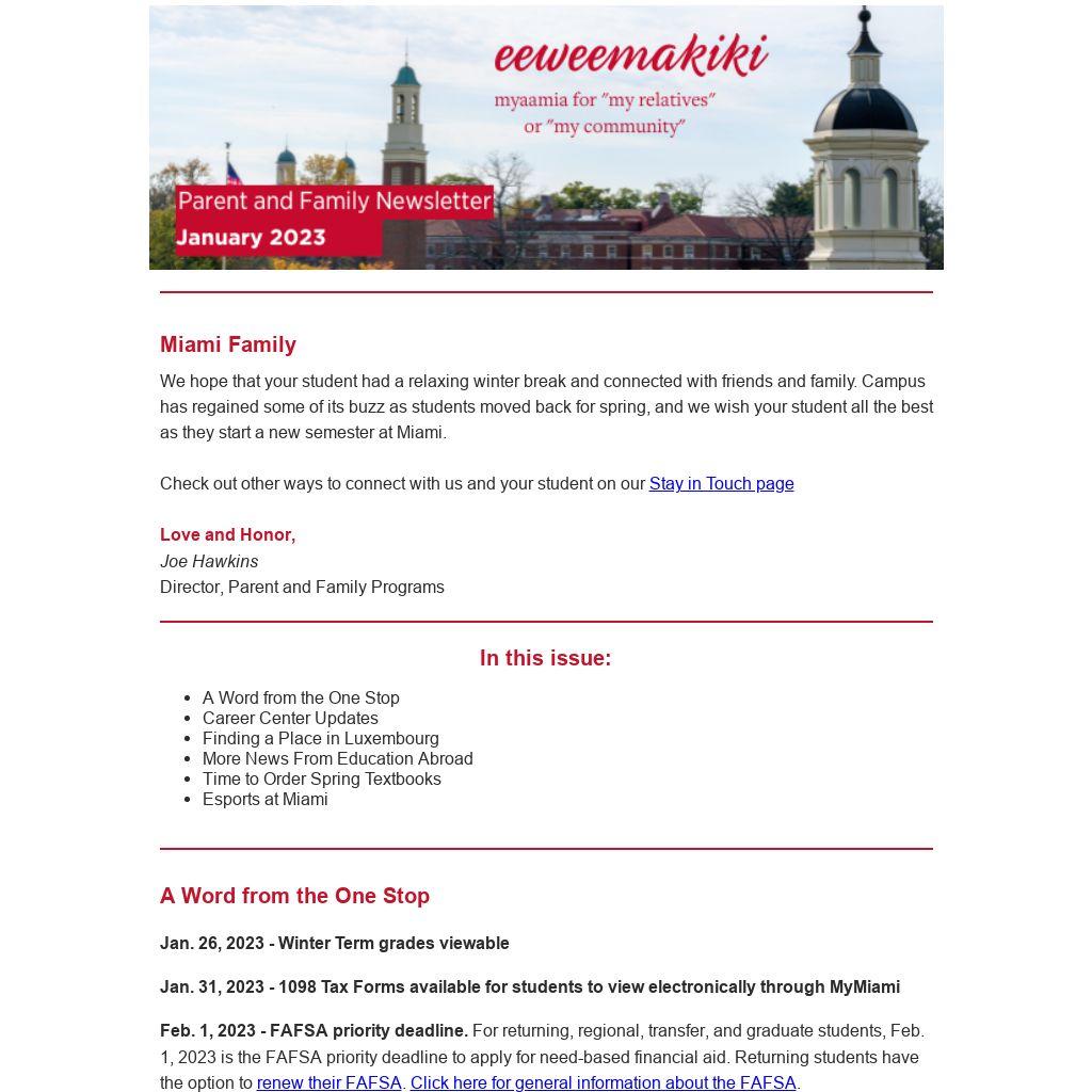 We hope that your student had a relaxing winter break and connected with friends and family. Campus has regained some of its buzz as students moved back for spring, and we wish your student all the best as they start a new semester at Miami.