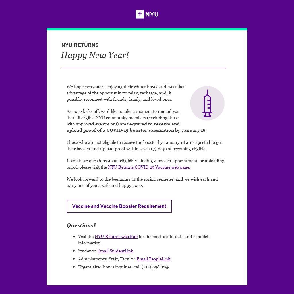 As 2022 kicks off, we’d like to take a moment to remind you that all eligible NYU community members (excluding those with approved exemptions) are required to receive and upload proof of a COVID-19 booster vaccination by January 18.