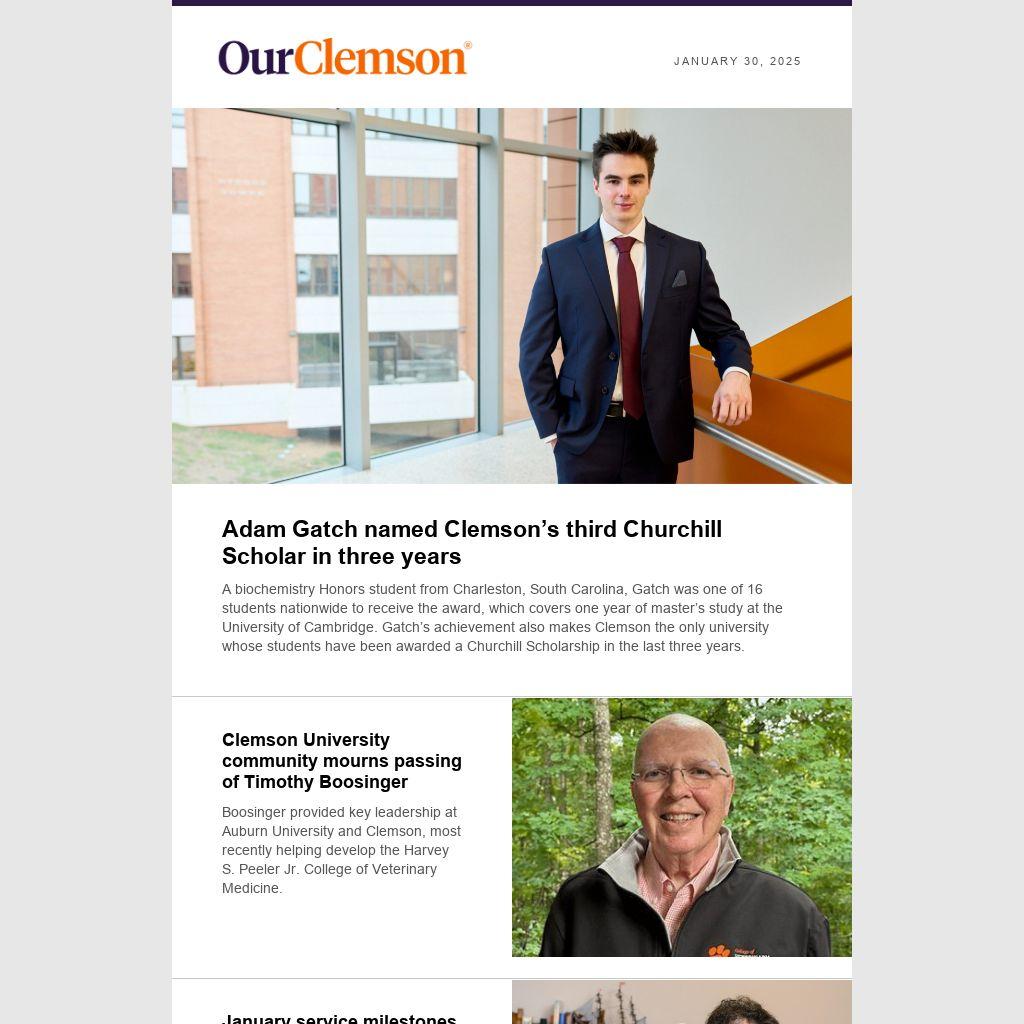 A biochemistry Honors student from Charleston, South Carolina, Gatch was one of 16 students nationwide to receive the award, which covers one year of master’s study at the University of Cambridge. Gatch’s achievement also makes Clemson the only university whose students have been awarded a Churchill Scholarship in the last three years.