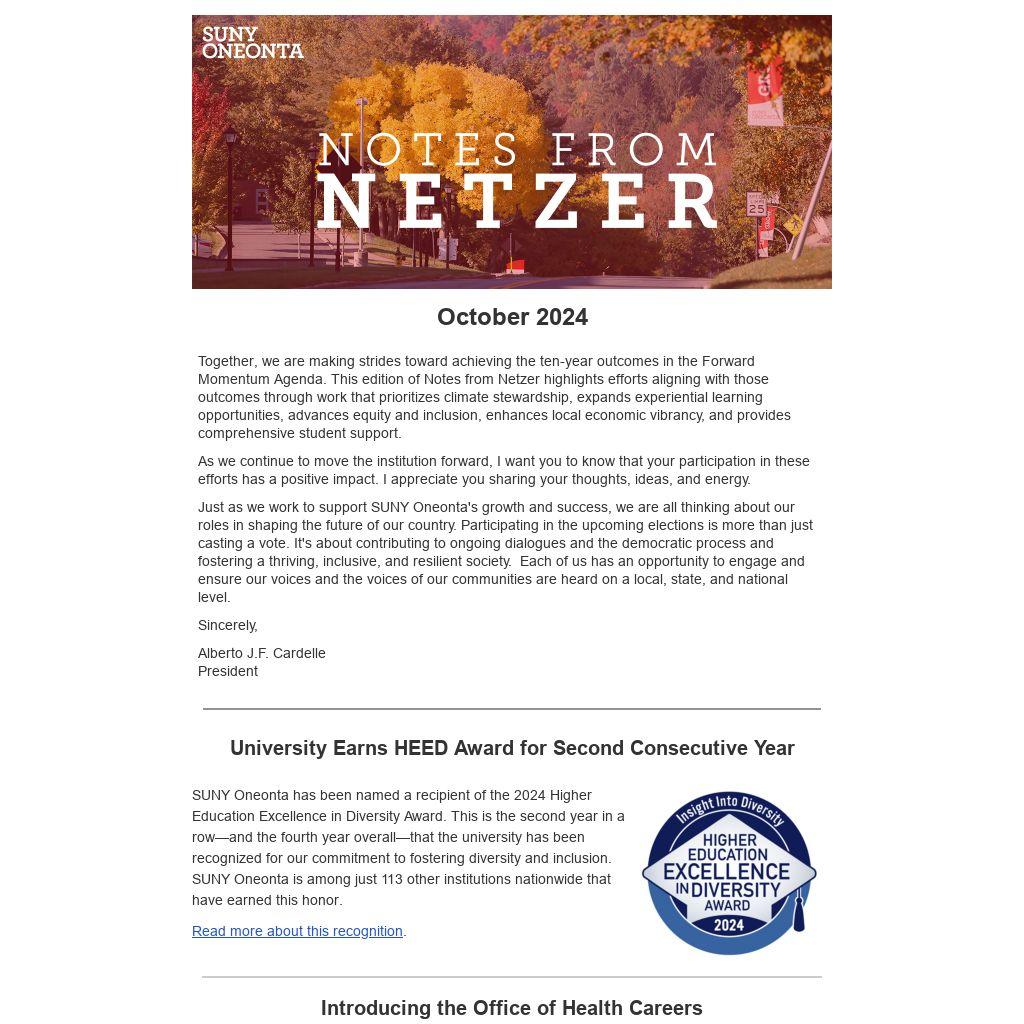 Notes from meetings of the President's Cabinet are shared with the university community monthly in Notes from Netzer. Questions can be directed to president@oneonta.edu.