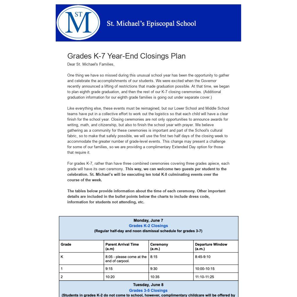 - All K-5 students report to their usual carpool drop-off point to be met and taken to the classroom prior to their ceremony. Grades 6-7 should report to the Great Hall.