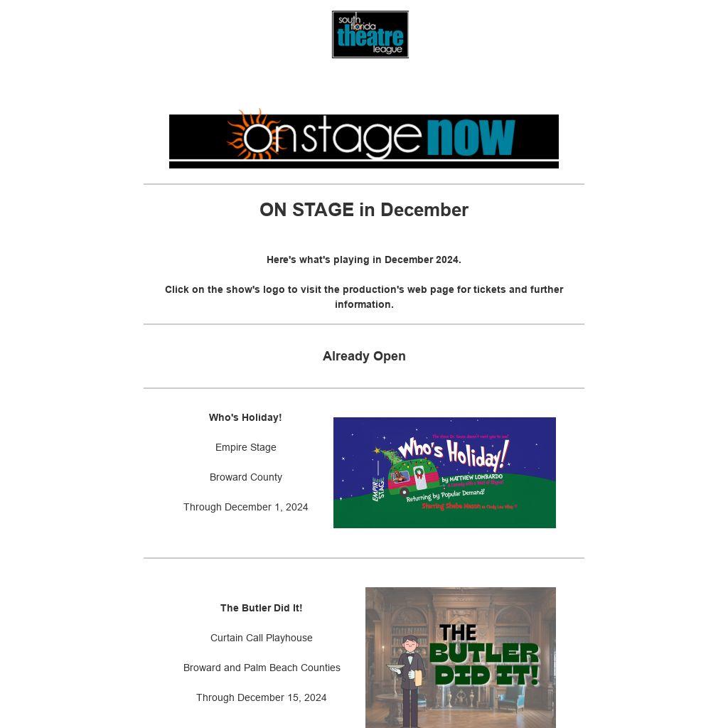 This email blast and other programs of the South Florida Theatre League are made possible with the support of Miami-Dade County Department of Cultural Affairs and the Cultural Affairs Council, the Miami-Dade County Mayor and Board of County Commissioners.