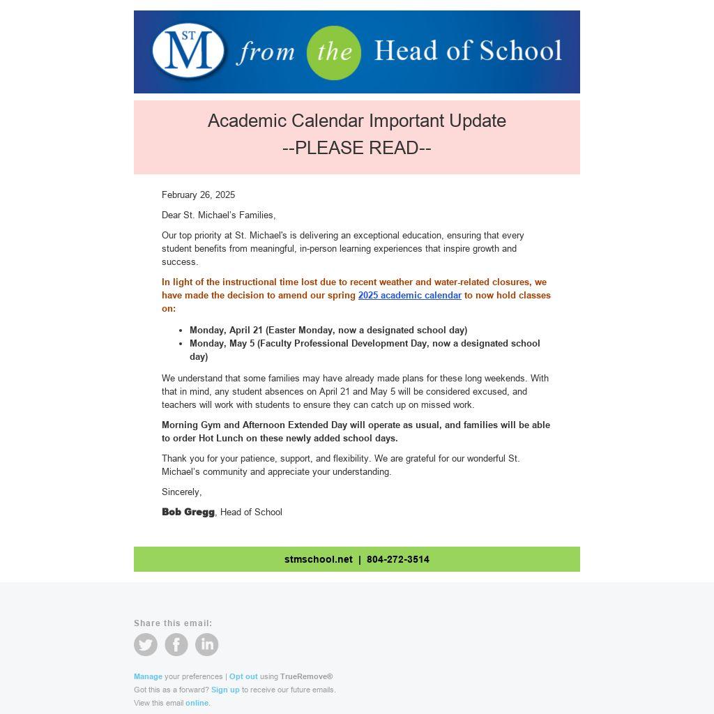 Thank you for your patience, support, and flexibility. We are grateful for our wonderful St. Michael’s community and appreciate your understanding.