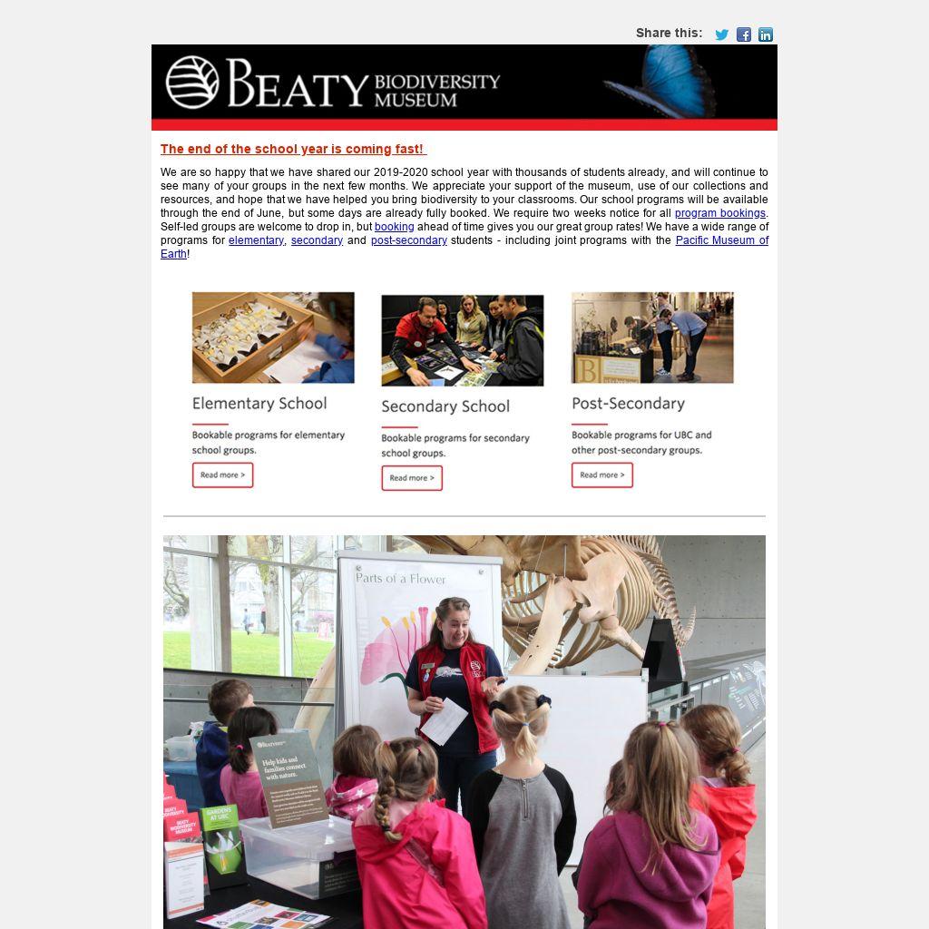 We are so happy that we have shared our 2019-2020 school year with thousands of students already, and will continue to see many of your groups in the next few months. We appreciate your support of the museum, use of our collections and resources, and hope that we have helped you bring biodiversity to your classrooms. Our school programs will be available through the end of June, but some days are already fully booked. We require two weeks notice for all program bookings. Self-led groups are welcome to drop in, but booking ahead of time gives you our great group rates! We have a wide range of programs for elementary, secondary and post-secondary students - including joint programs with the Pacific Museum of Earth!