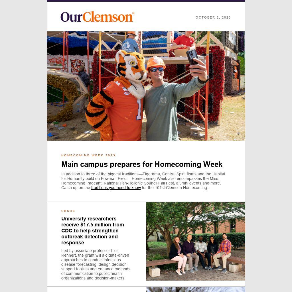 In addition to three of the biggest traditions—Tigerama, Central Spirit floats and the Habitat for Humanity build on Bowman Field— Homecoming Week also encompasses the Miss Homecoming Pageant, National Pan-Hellenic Council Fall Fest, alumni events and more. Catch up on the traditions you need to know for the 101st Clemson Homecoming.