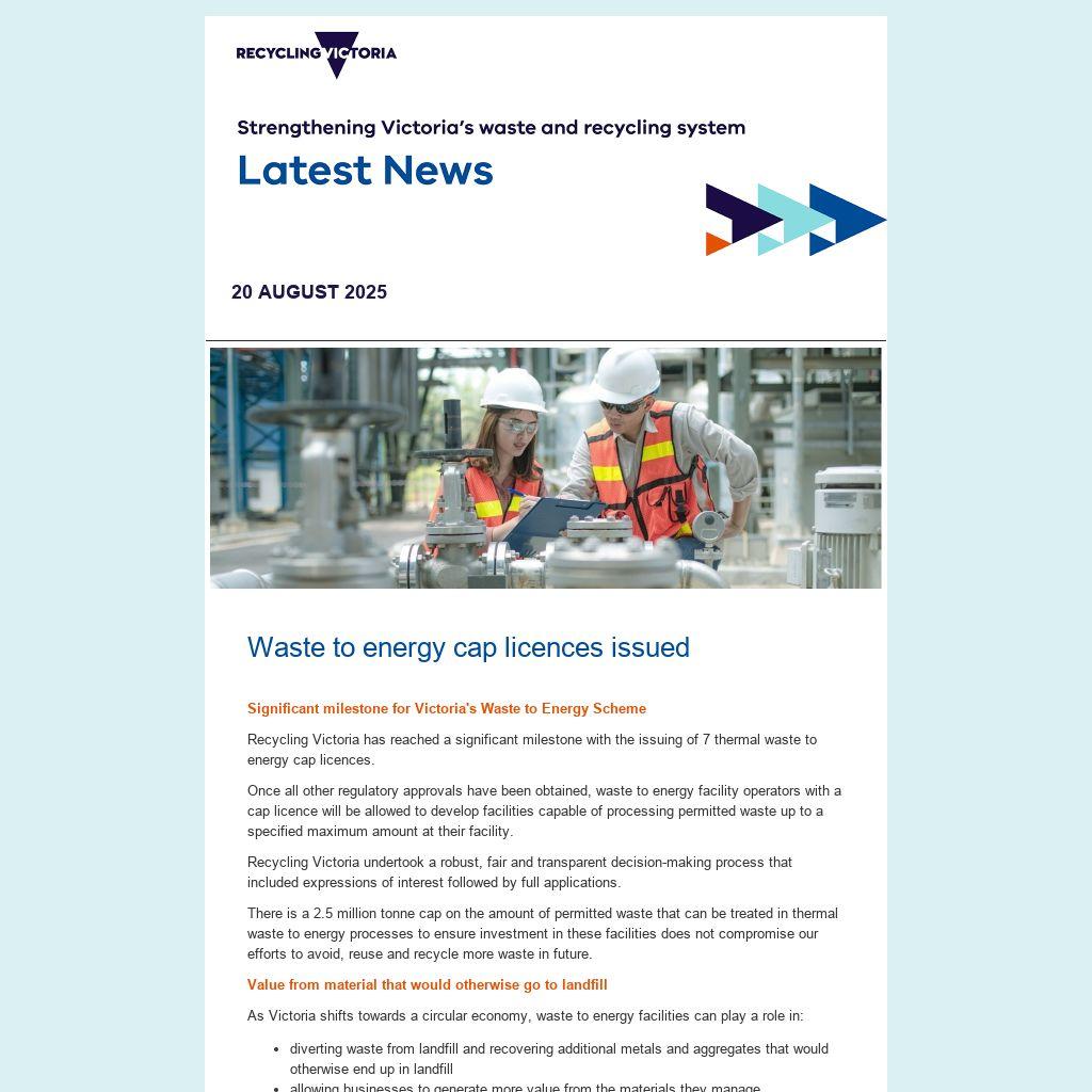 Recycling Victoria has reached a significant milestone with the issuing of 7 thermal waste to energy cap licences.