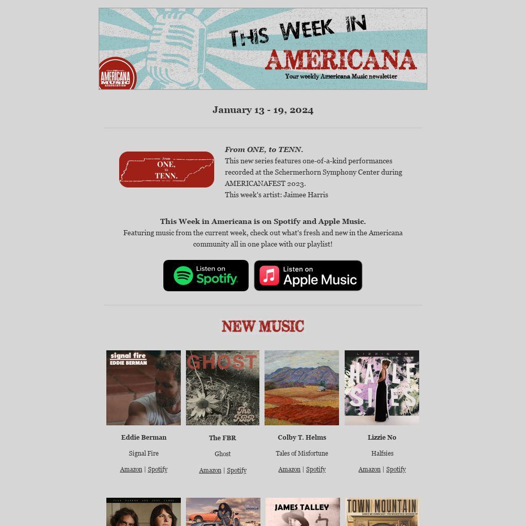 This Week in Americana is on Spotify and Apple Music. Featuring music from the current week, check out what's fresh and new in the Americana community all in one place with our playlist!