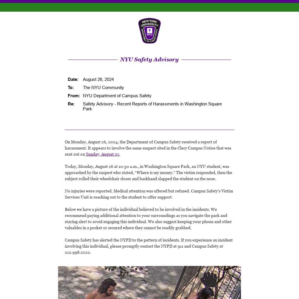On Monday, August 26, 2024, the Department of Campus Safety received a report of harassment. It appears to involve the same suspect cited in the Clery Campus Notice that was sent out on