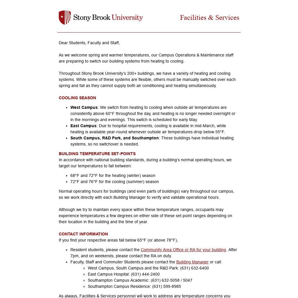 Throughout Stony Brook University’s 200+ buildings, we have a variety of heating and cooling systems. While some of these systems are flexible, others must be manually switched over each spring and fall as they cannot supply both air conditioning and heating simultaneously.