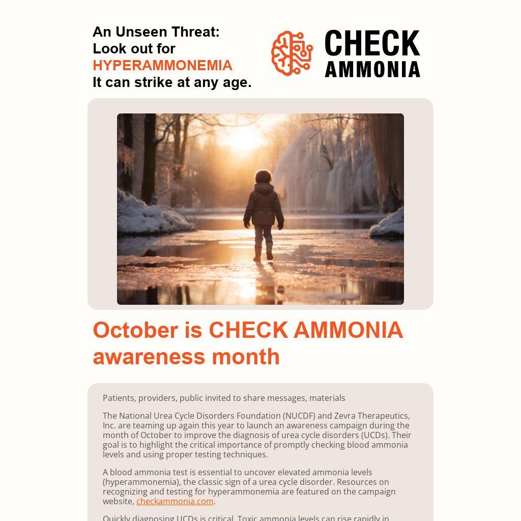 The National Urea Cycle Disorders Foundation (NUCDF) and Zevra Therapeutics, Inc. are teaming up again this year to launch an awareness campaign during the month of October to improve the diagnosis of urea cycle disorders (UCDs). Their goal is to highlight the critical importance of promptly checking blood ammonia levels and using proper testing techniques.