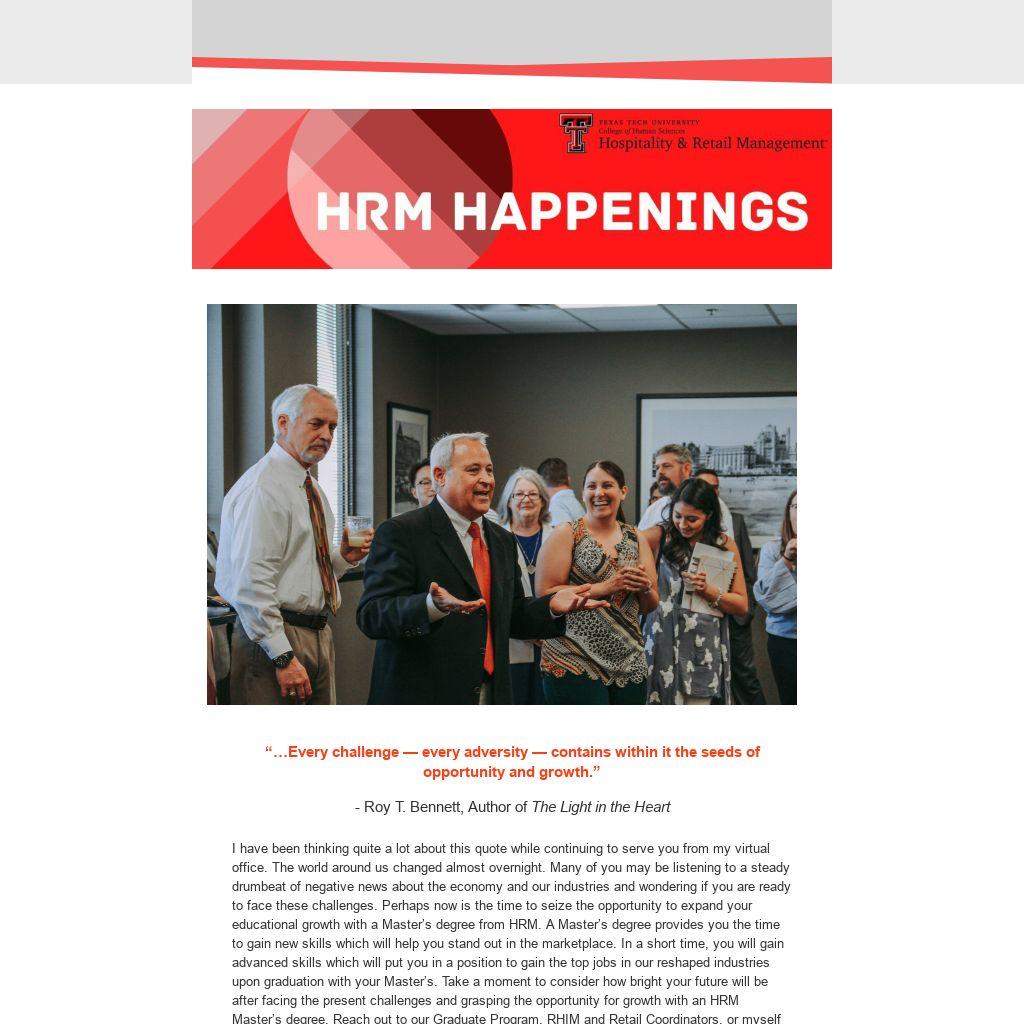 I have been thinking quite a lot about this quote while continuing to serve you from my virtual office. The world around us changed almost overnight. Many of you may be listening to a steady drumbeat of negative news about the economy and our industries and wondering if you are ready to face these challenges. Perhaps now is the time to seize the opportunity to expand your educational growth with a Master’s degree from HRM. A Master’s degree provides you the time to gain new skills which will help you stand out in the marketplace. In a short time, you will gain advanced skills which will put you in a position to gain the top jobs in our reshaped industries upon graduation with your Master’s. Take a moment to consider how bright your future will be after facing the present challenges and grasping the opportunity for growth with an HRM Master’s degree. Reach out to our Graduate Program, RHIM and Retail Coordinators, or myself to discuss your opportunities. You will find links to each of us enclosed in this newsletter, along with tips; testimonials, special programs and scholarship opportunities, program information, and more. We are looking forward to hearing from you.