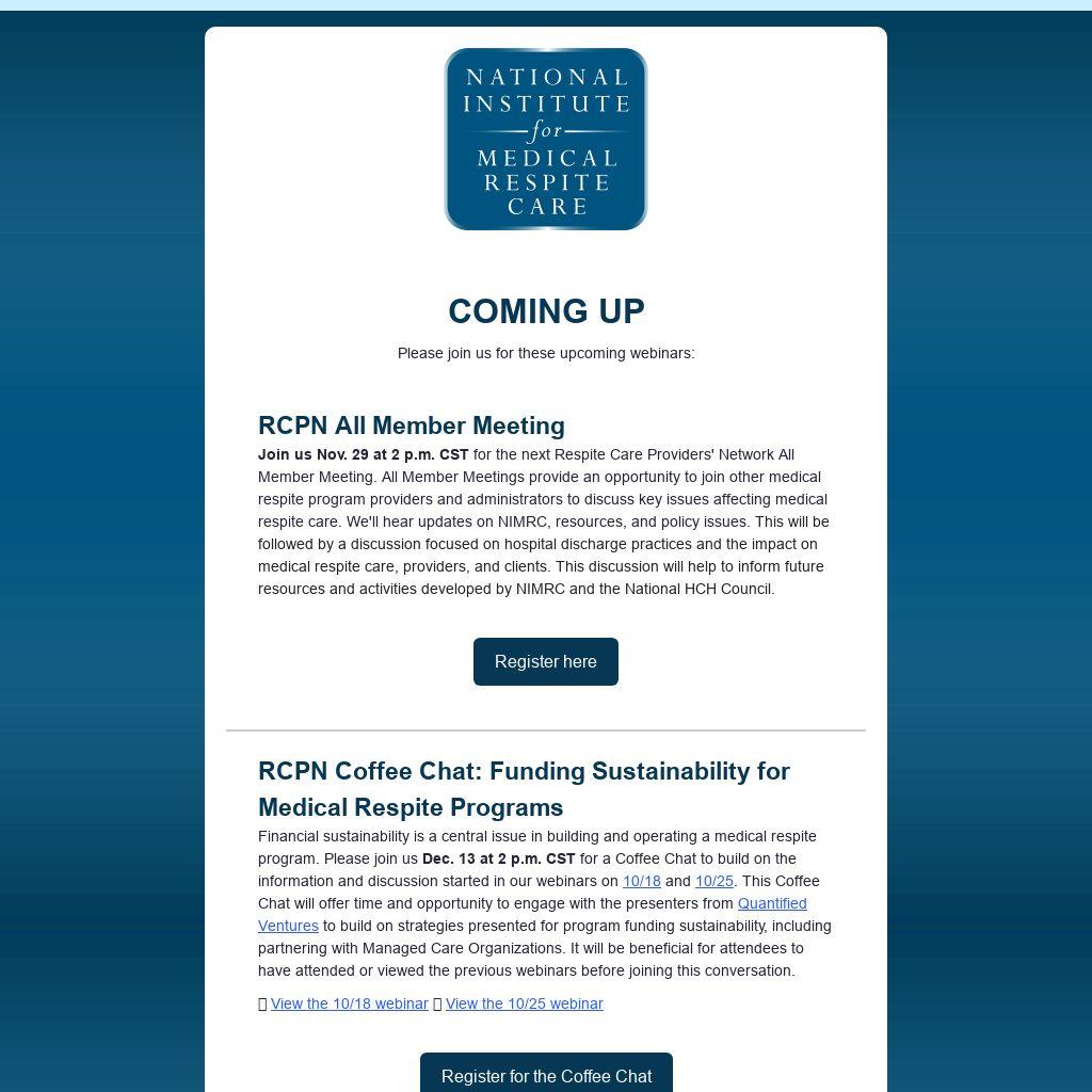 Join us Nov. 29 at 2 p.m. CST for the next Respite Care Providers' Network All Member Meeting. All Member Meetings provide an opportunity to join other medical respite program providers and administrators to discuss key issues affecting medical respite care. We'll hear updates on NIMRC, resources, and policy issues. This will be followed by a discussion focused on hospital discharge practices and the impact on medical respite care, providers, and clients. This discussion will help to inform future resources and activities developed by NIMRC and the National HCH Council.